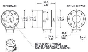 The six-axis AD.25D is available in four vertical load capacities of 100, 250, 500, or 1,000 lbs (see Specifications Tables). Complete with an anodized finish, this strain gage load cell also features an internal aluminum shell to ensure mechanical protection of the sensing elements and wiring.
