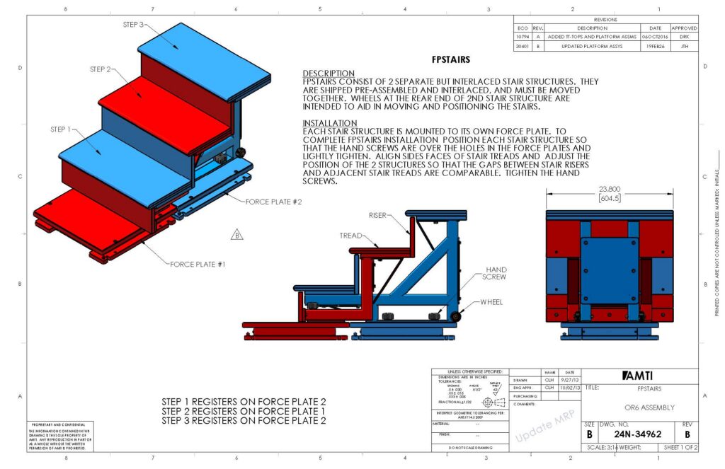 Solid top force plates available in our 40×60 or 46×51 cm standard sizes can be made to accept a stairway, which is attached to threaded inserts on the top surfaces of the platforms. The standard stairway design features 23.8″ wide steps, each with a 7″ rise and 10.4″ run.