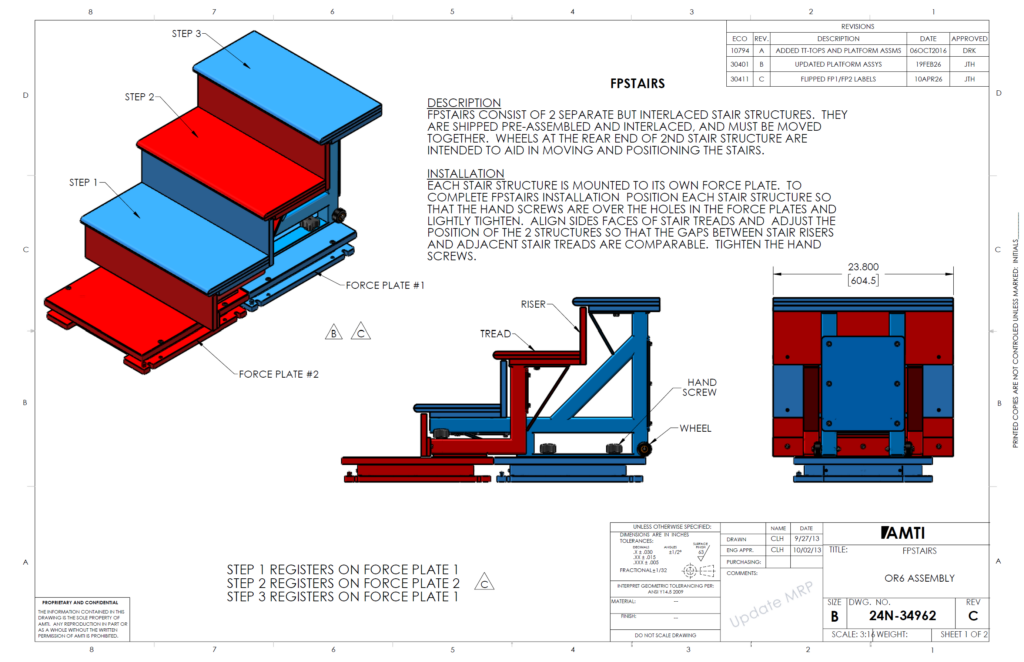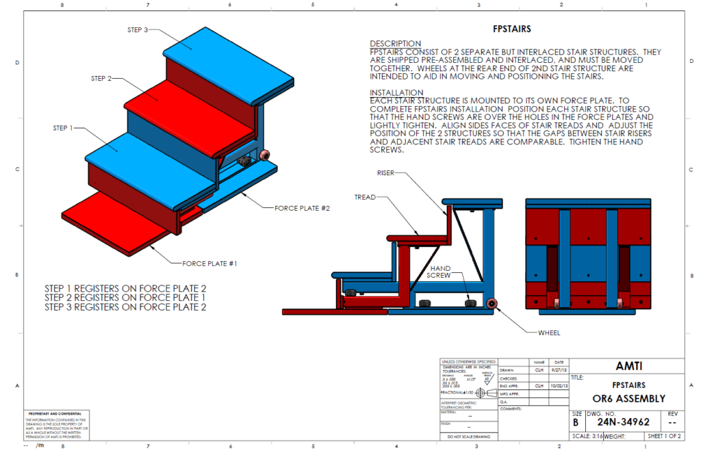 AMTI’s removable force plate stairs isolate the forces and moments generated during four consecutive steps and transfers them to one of two underlying force plates. The stairway uses an innovative nesting design to alternate the platform to which each step is connected, so that no two consecutive steps transfer to the same force plate.