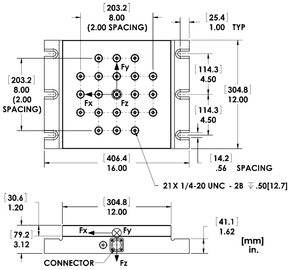 The MC12 is the ideal sensor for manufacturing and machining measurements. With a 12 in. square top mounting surface, this six-axis transducer is equipped with 21 threaded inserts, as well as a flanged base for T-slot mounting. Built with 7075-T6 aluminum alloy, the MC12 is designed to withstand harsh testing and manufacturing conditions with precise repeatability. A protective anodized finish is used on the exterior to resist corrosion.