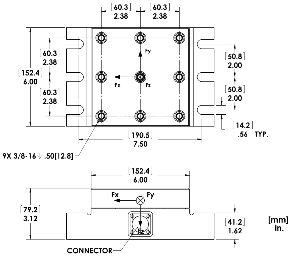 The MC6 is a square-top sensor that is designed for long term stability and reliable performance. This transducer is available in multiple vertical load capacities between 1,000 lb and 4,000 lb (see Specifications Tables). Providing up to six channels of output, the MC6 avoids excessive zero shift and exhibits maximum stiffness when mounted. The six inch top surface is equipped with threaded inserts and the flanged base allows for T-slot mounting.