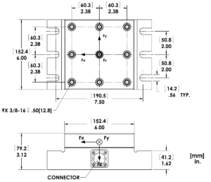 The MC6 is a square-top sensor that is designed for long term stability and reliable performance. This transducer is available in multiple vertical load capacities between 1,000 lb and 4,000 lb (see Specifications Tables). Providing up to six channels of output, the MC6 avoids excessive zero shift and exhibits maximum stiffness when mounted. The six inch top surface is equipped with threaded inserts and the flanged base allows for T-slot mounting.