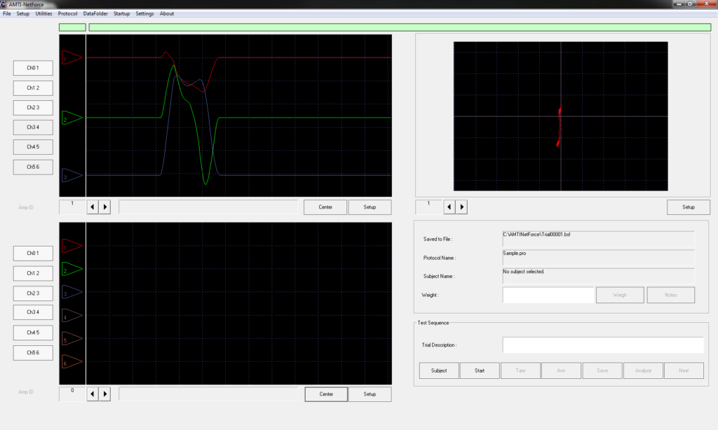 NetForce is AMTI’s data acquisition software designed to gather data from our multi-axis force plates and force sensors. NetForce is provided complimentary with all AMTI transducers. Acquired data may be saved at any time to a binary file (.BSF file compatible with AMTI’s BioAnalysis program) and/or may be exported to a text file, compatible with many third-party spreadsheet and analysis programs.