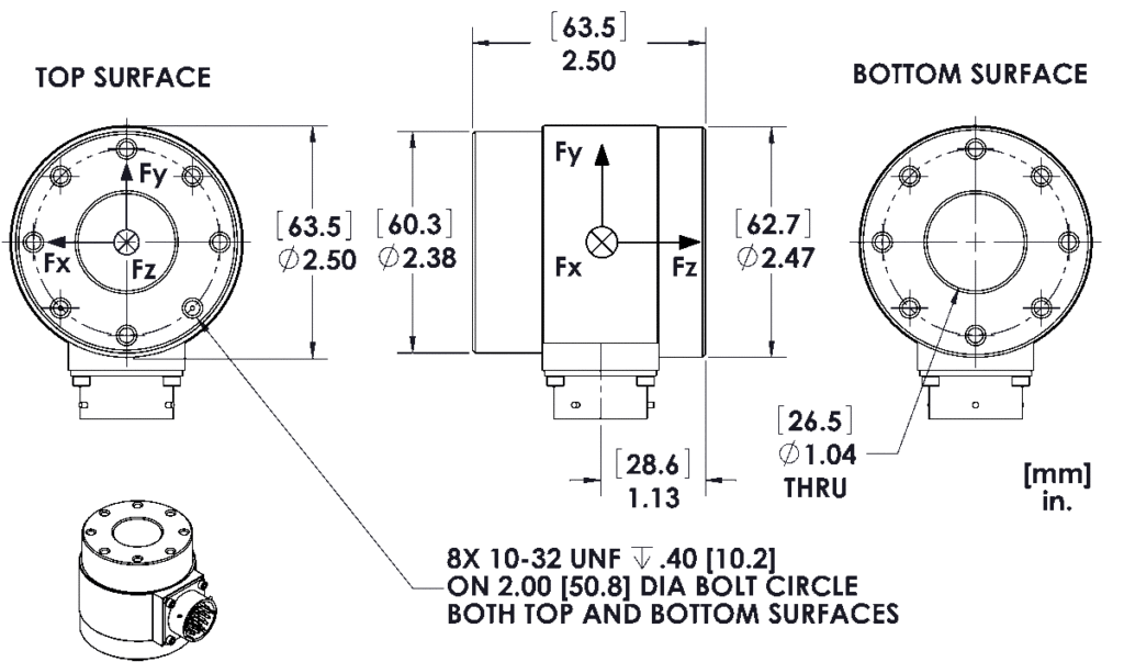 The SD2.5D features six-channel output and is constructed with a cylindrical strain element with a stainless steel cover to ensure mechanical protection of the gages. The top and bottom surfaces of the sensor have threaded attachments for convenient and secure mounting.