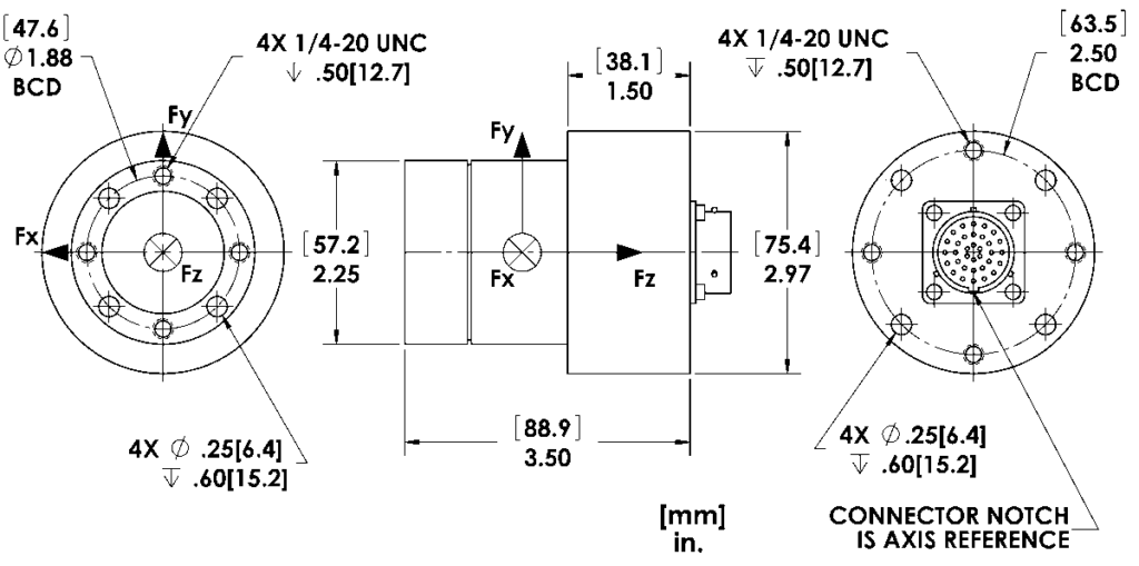 The UDW3 is a waterproof, six-component sensor designed for accurate underwater force measurements. Manufactured from heat-treated stainless steel, this 3 inch diameter sensor features an end connector and mounting surfaces equipped with threaded holes for easy attachment. The UDW3 is available in multiple load capacities between 100 lb and 1,000 lb (see Specifications Tables).